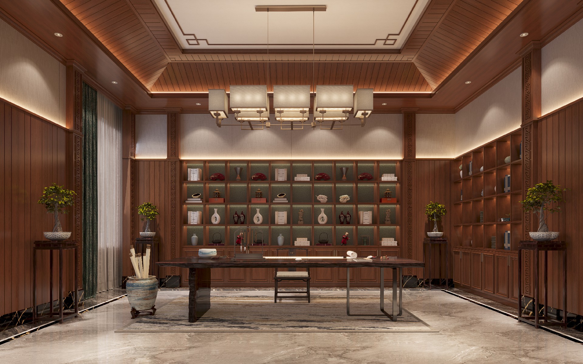 整面墻的TSCN(托斯卡納)美裝家黃花梨木墻板與絲織駝墻板從墻面直抵穹頂,木材自然的棕紅色澤在頂燈映照下,